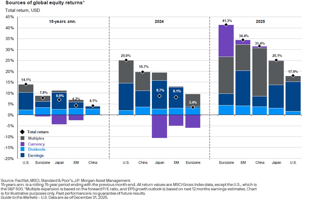 Valuations played an important role. International equities entered the year trading at a 30–40% discount to U.S. markets, a gap that remains wide by historical standards. Over the past decade, U.S. equity returns have benefited significantly from rising valuation multiples, while international returns have relied more on earnings growth, dividends, and currency movements. In 2025, those factors aligned more favorably outside the U.S.