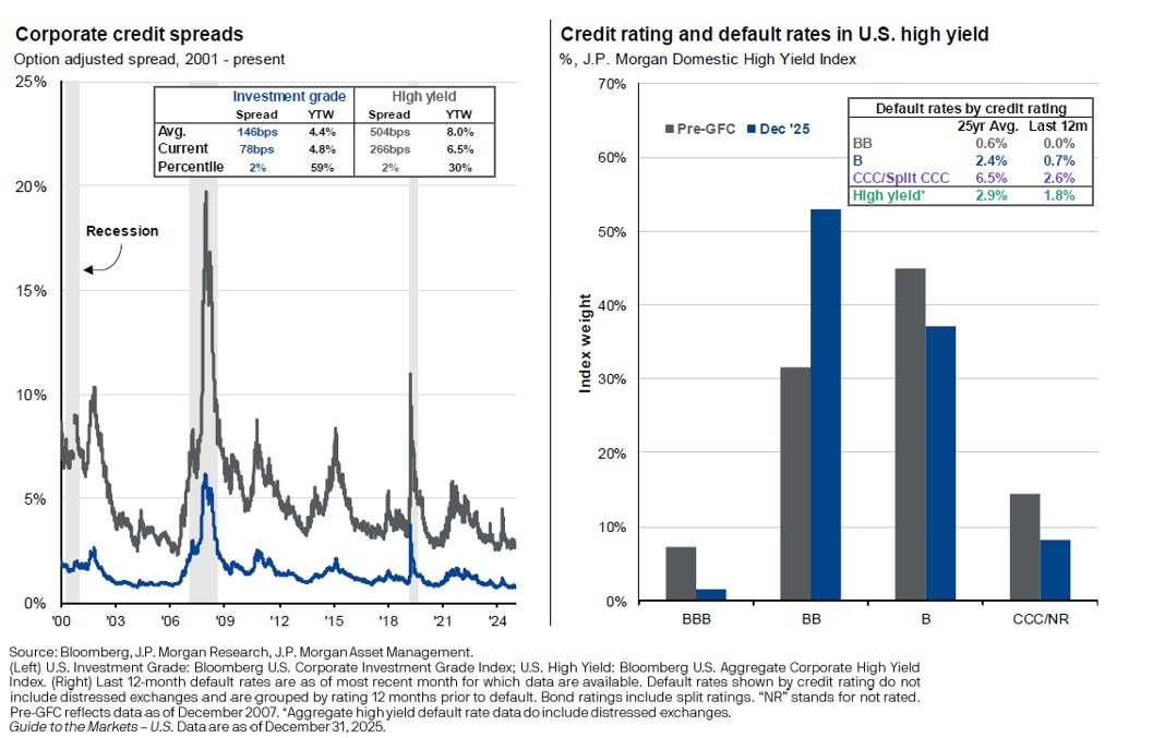 The Federal Reserve signaled that policy rates are likely to trend gradually lower over time, toward a long-run level near 3.0%, assuming continued progress on inflation. Credit markets remained healthy, with investment-grade and high-yield spreads near the lower end of historical ranges and default rates well contained.