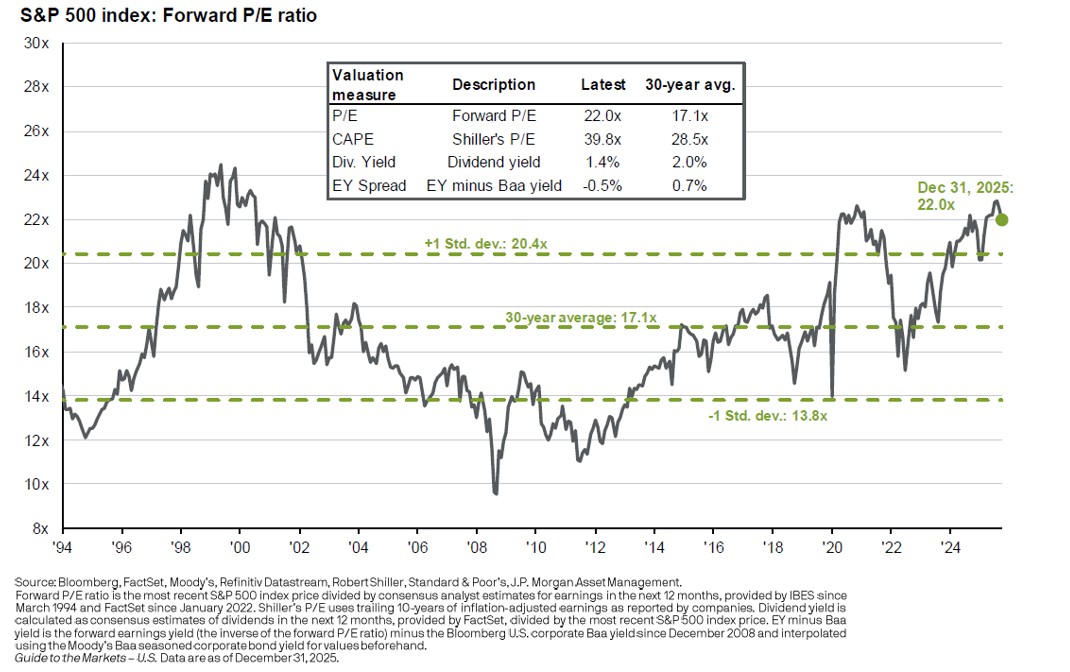 At the same time, optimism became increasingly reflected in prices. The S&P 500 ended the year trading at a forward price-to-earnings ratio of 22.0x, well above its 30-year average of 17.1x.