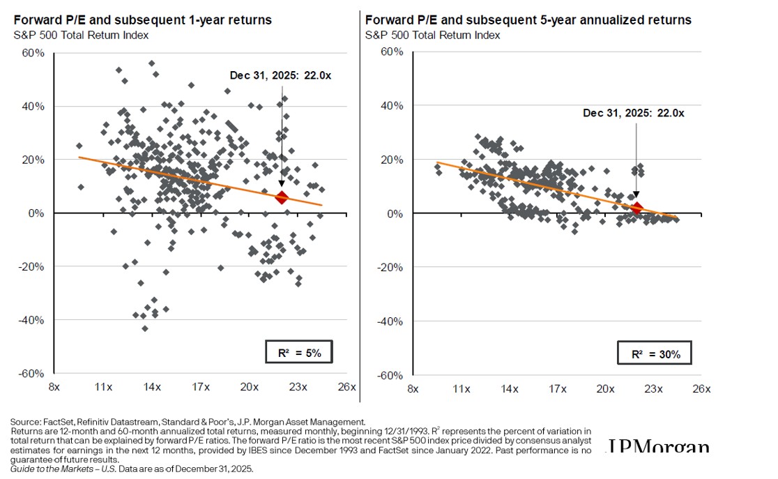 Valuations are not a reliable guide to short-term market movements, but they do matter over longer horizons. Historically, starting valuations have shown a much stronger relationship with five-year forward returns than with one-year results.