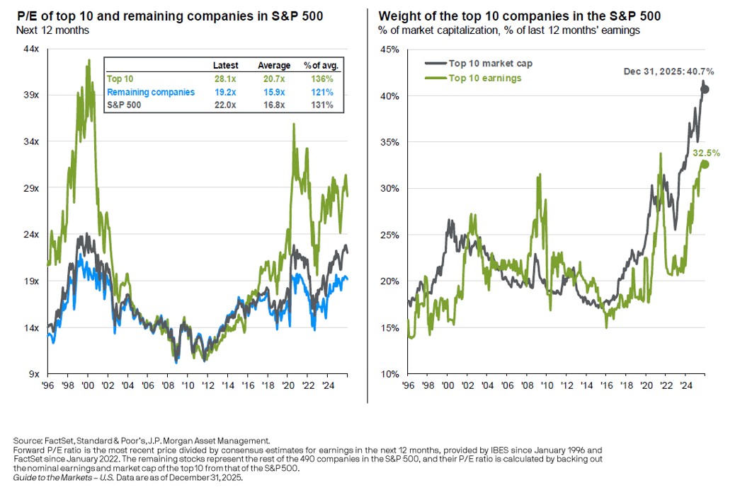 Market concentration remained elevated. The ten largest companies now represent roughly 40.7% of the S&P 500, near historical extremes.