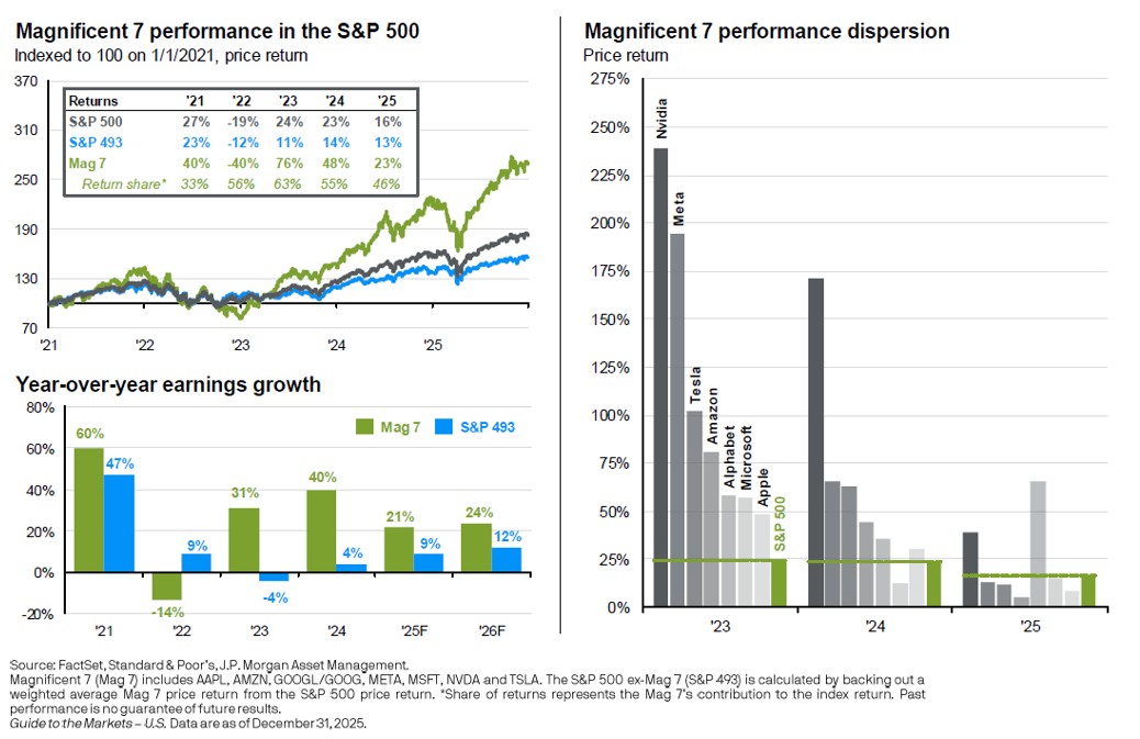 The “Magnificent 7” again accounted for a disproportionate share of returns—about 46% of index performance in 2025—reflecting their scale, profitability, and earnings momentum.