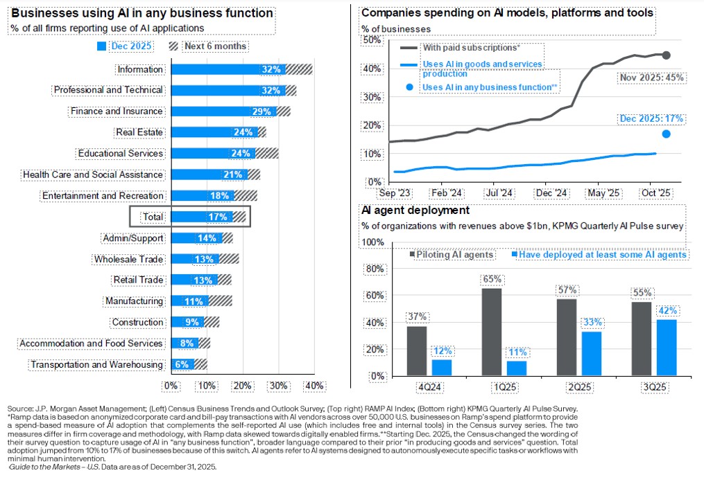 This level of investment has naturally fueled investor enthusiasm around AI’s long-term potential, but it also raises reasonable questions about returns on invested capital. In 2025, investors periodically expressed concern around whether some companies—such as Oracle and Meta—would ultimately earn attractive returns on this spending, leading to periods of volatility. Even so, the data make clear that capital markets remain willing to fund this investment cycle, with AI adoption broadening across industries and corporate spending on AI tools continuing to accelerate.