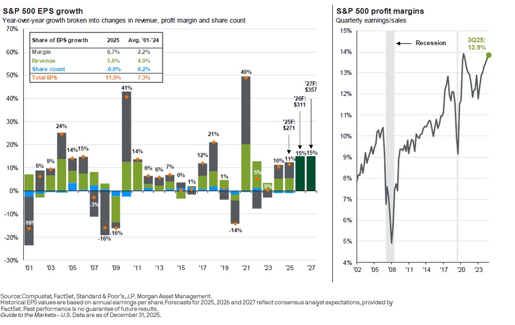 Corporate fundamentals, however, remain supportive. Profit margins reached approximately 13.9% in the third quarter, well above long-term averages, and earnings expectations for 2026 remain constructive. Still, margins at these levels leave less room for error should growth slow or costs rise.